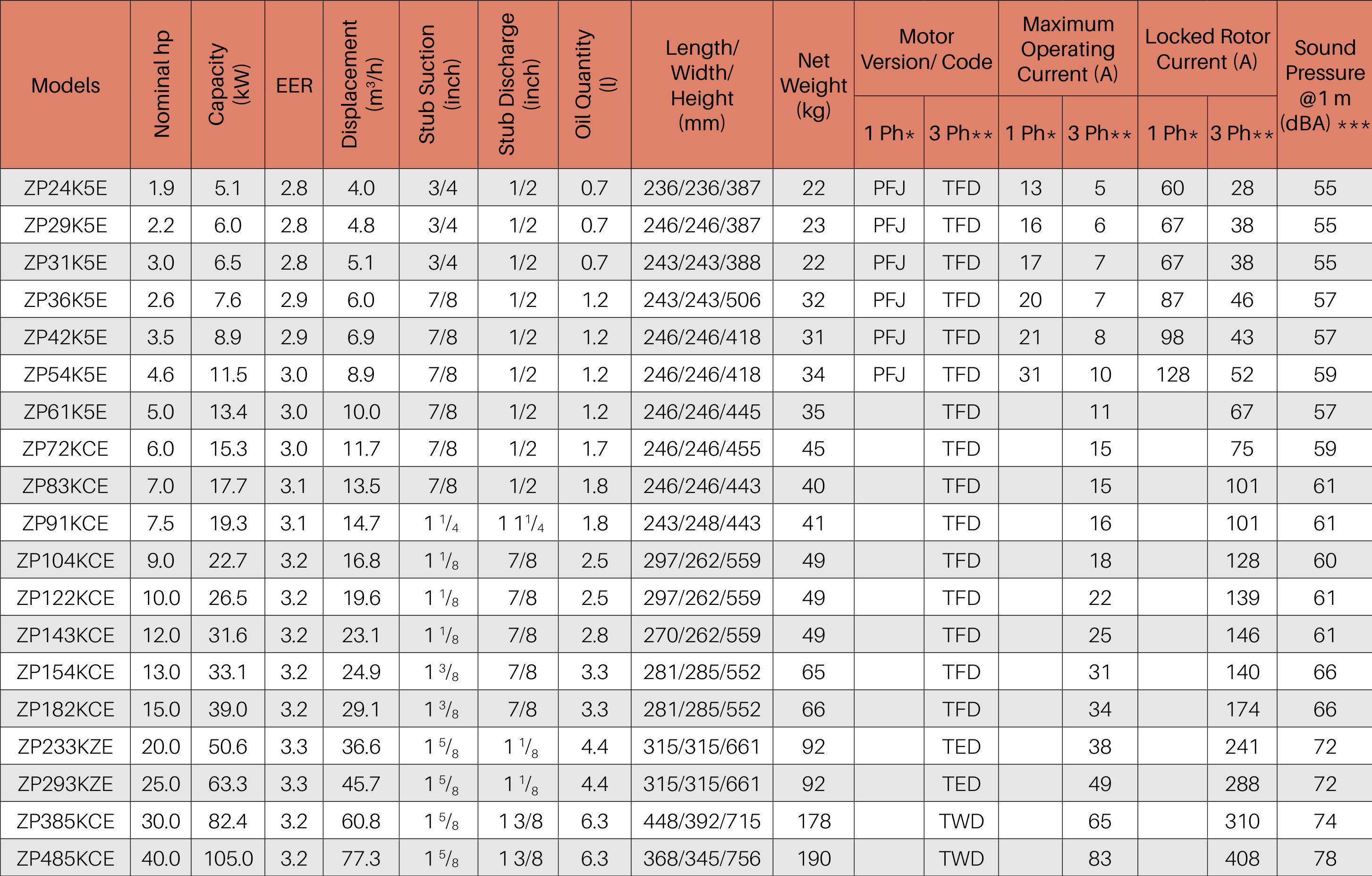 Οι scroll συμπιεστές ZP*K5E/KCE για R410A σε εφαρμογές κλιματισμού έχουν σχεδιαστεί για υψηλή απόδοση και αξιοπιστία σε συστήματα ψύξης με αέρα, με θερμοκρασίες εξάτμισης περίπου +5°C.